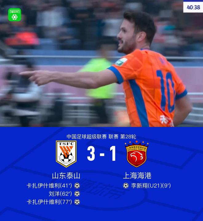 北京时间10月26日,中国足球超级联赛第28轮比赛,山东泰山主场迎战上海港。山东泰山卡扎伊什维利打进两球,刘洋打进一球。上海港李兴山表示。最终比分是山东泰山3-1上海海港。重要事件:第8分钟,刘若钒助攻李心翔进球!首回合海钢1-0领先山东!第40分钟,泰山队发起反击,卡扎伊什维利打入个人联赛第23球,让泰山队将比分扳成1-1!第61分钟,泽卡接刘洋助攻破门,山东2-1战胜海钢。第77分钟结束比赛?卡扎伊什维利凌空抽射破门!泰山3-1领先凯科!比赛最精彩的时刻就是两队球员的上场时刻。彭潇立即开始了比赛。路易斯·洛佩斯在派对开始前短暂被换下。第7分钟,李兴山越位。后王大雷同意化解危险。第8分钟,刘若钒助攻李心翔破门!首回合海钢1-0领先山东!第一个射门发生在第12分钟。彭潇一脚飞踢拦截。第15分钟,彭潇外围射门,被杨峻霖神勇扑出。第18分钟,刘若钒看台上射门,但皮球被挡住。第20分钟,莱昂纳多射门被门将扑出。 ,球被救了。第34分钟,李兴山禁区内接球,射门偏出。第39分钟,梅伦多尝试远射,但皮球被挡住。第40分钟,泰山队发起反击,卡扎伊什维利打入个人联赛第23球,让泰山队将比分扳成1-1!第50分钟,克雷桑的头球攻门可惜撞入了球门内。第61分钟,泽卡接刘洋助攻破门,山东2-1战胜海钢。在 66第分钟,王大雷感觉右肩不适,接受了队医的治疗。你是在第77分钟决定比赛胜负的吗?卡扎伊什维利凌空抽射破门!泰山3-1领先凯科!第85分钟,克雷萨努外线尝试远射,皮球打高。第90+1分钟,库雷桑大力射门,被杨峻霖扑出。球队阵容技术统计